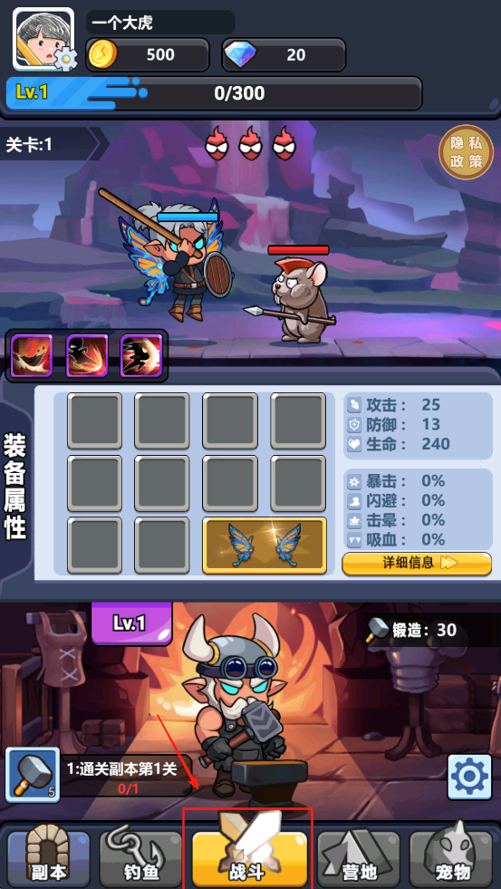 2、點擊“戰斗”按鈕參與戰斗。通過戰斗提升角色等級,獲取更多游戲資源。