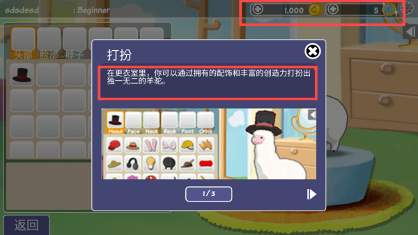 3、利用擁有的配飾,發(fā)揮創(chuàng)造力,在更衣室通過(guò)【頭部】【臉部】【脖子】等部位的裝扮,打造獨(dú)特羊駝。